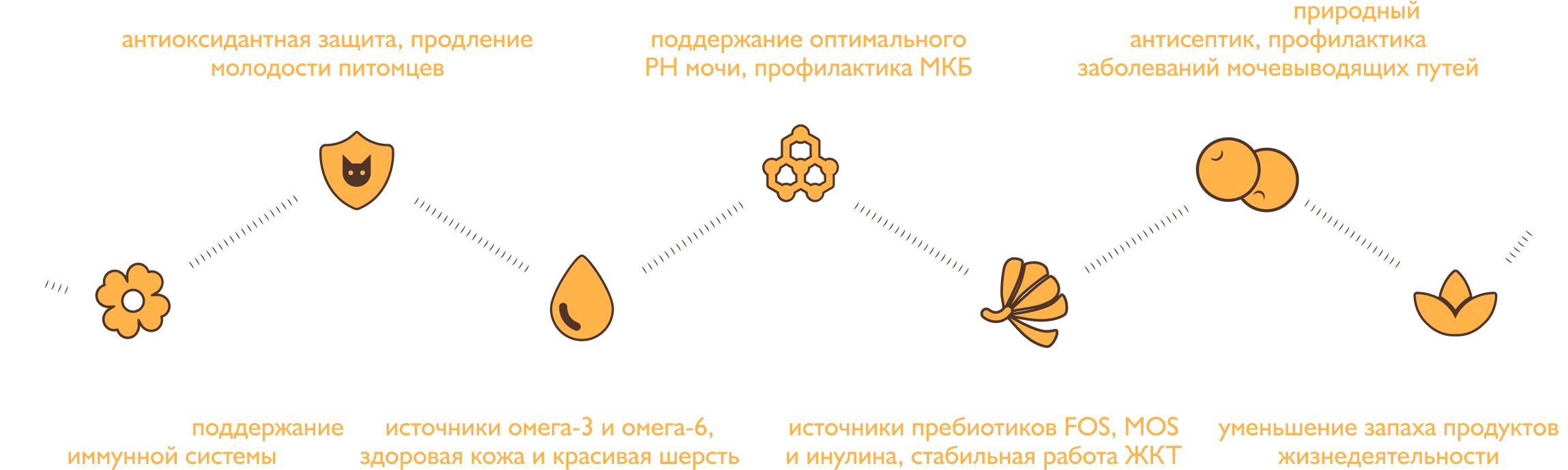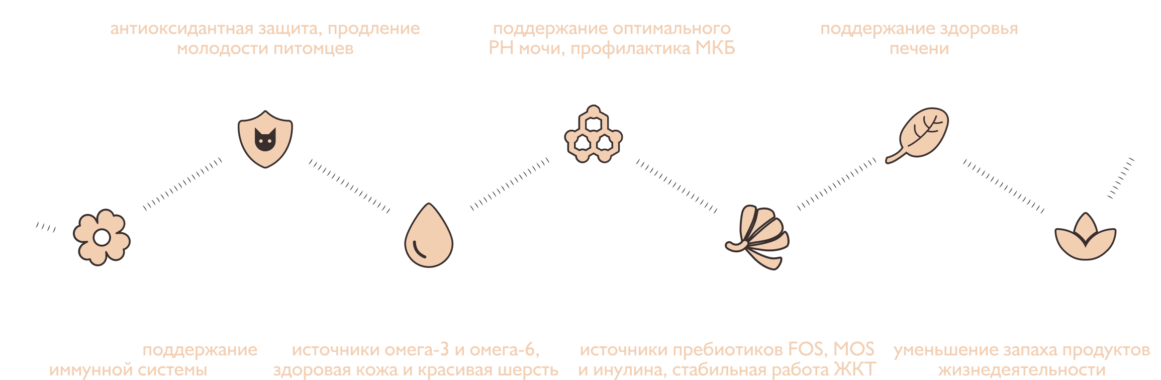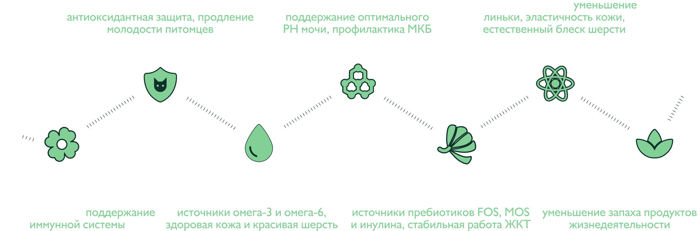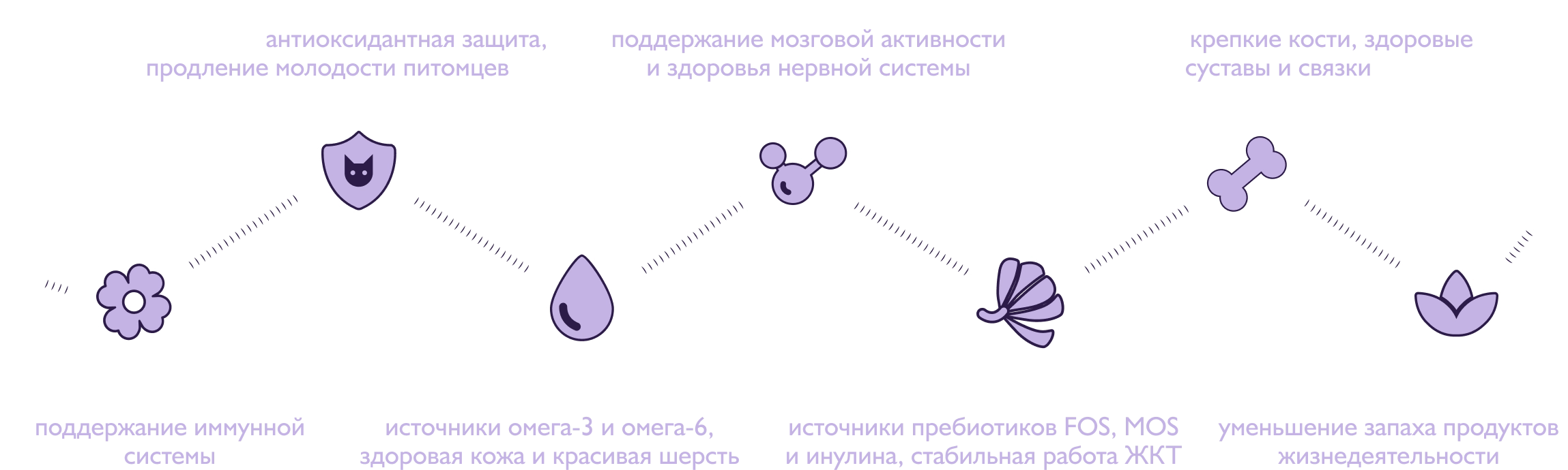 Функциональные компоненты — витамины, минералы, аминокислоты, экстракты лекарственных растений и ценные масла, которые в каждом вкусе обеспечивают поддержку здоровья питомцев по 6 ключевым направлениям: