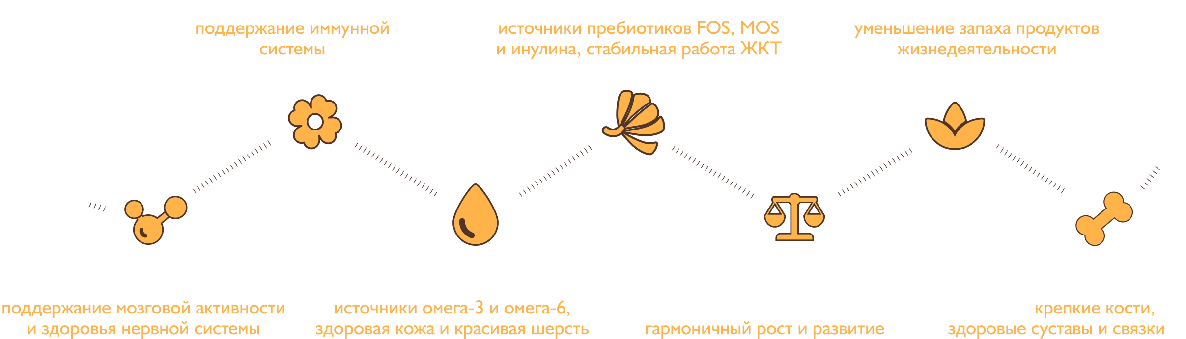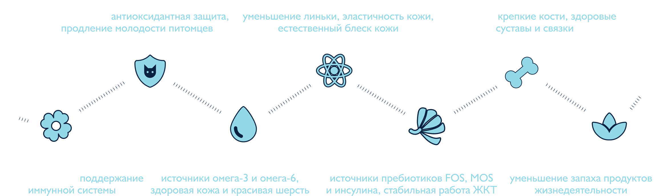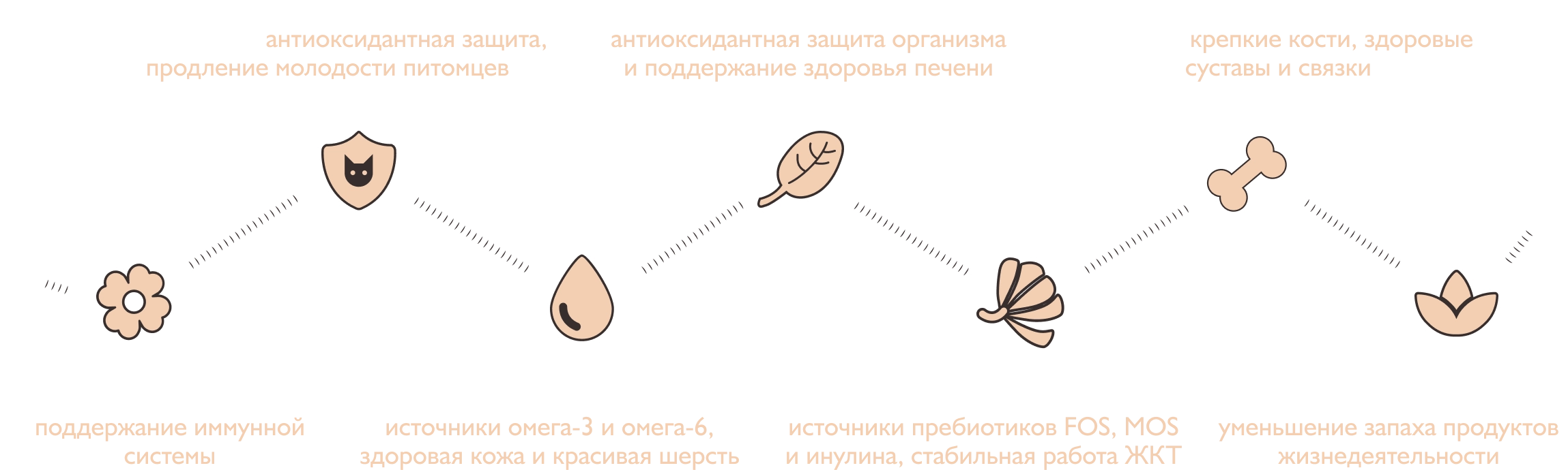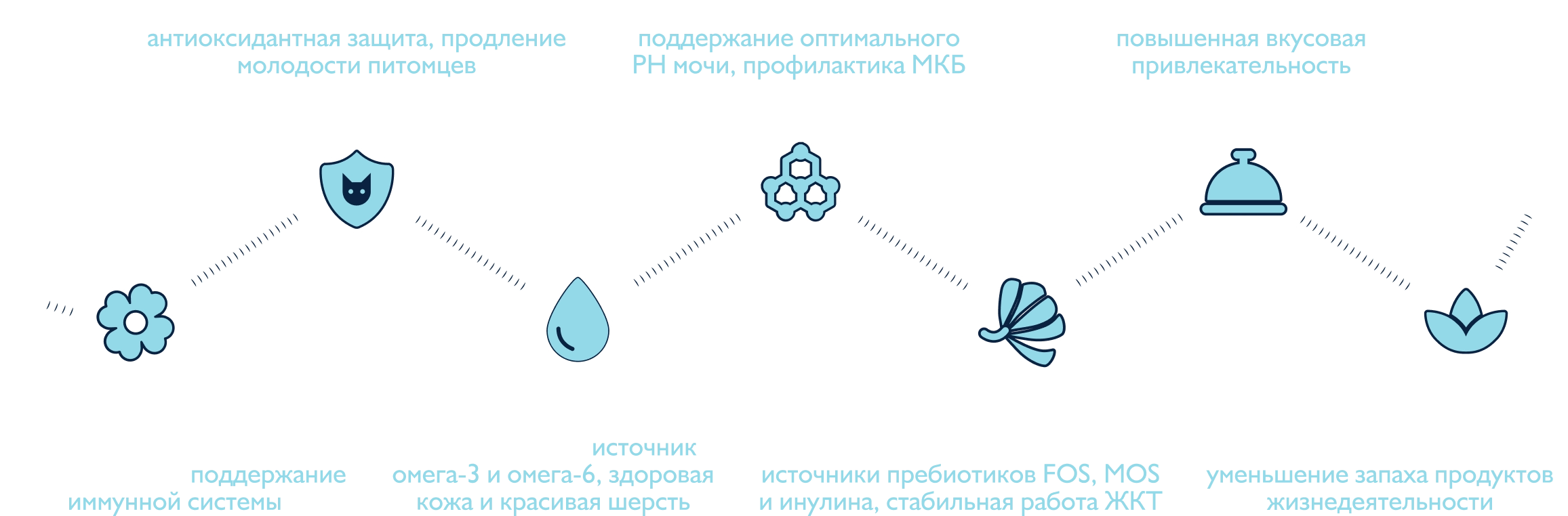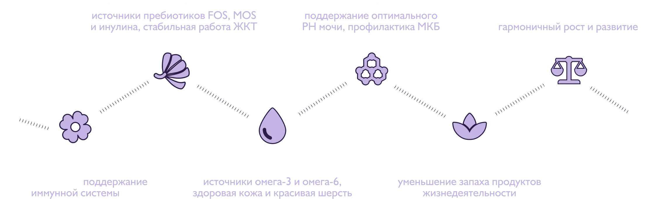 Функциональные компоненты — витамины, минералы, аминокислоты, экстракты лекарственных растений и ценные масла, которые в каждом вкусе обеспечивают поддержку здоровья питомцев по 6 ключевым направлениям: